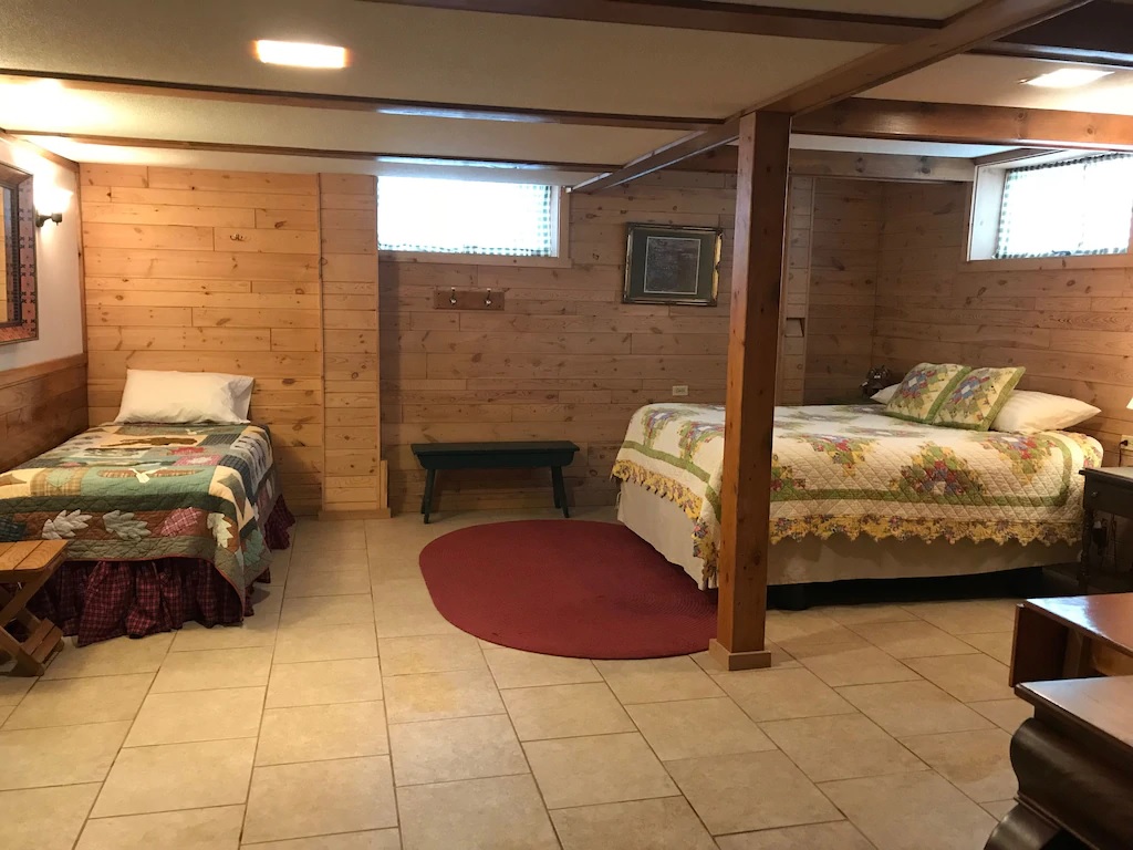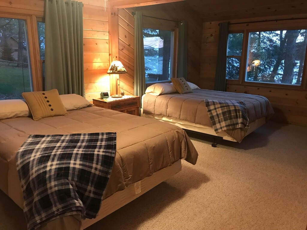 Lac Vieux at sunsetLake HouseFireplace in the main family roomWarm & cozy in the winterBedroom 1, 2 queen bedsBedroom 2, 2 queen bedsPontoon rental availableKayaks available with your stayFinished basement and gameroomPing pong tableAdditional sleeping in the basementPool table